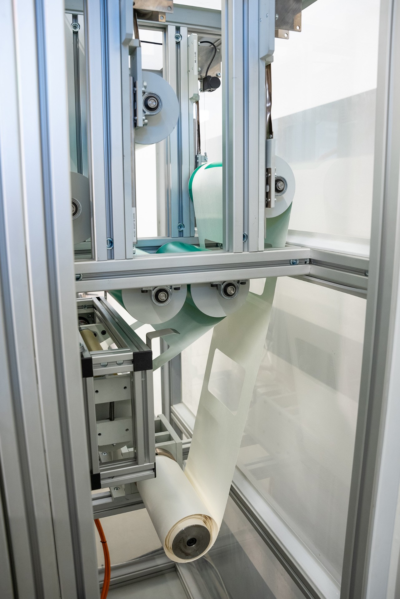 密封模块后的卷纸架。可以清楚地看到四边袋的切口。