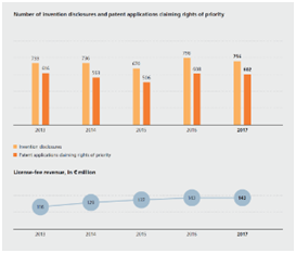 为确保从知识产权开发中持续获得收益,不同机构拥有的专利越来越多地集中在特定的组合申请中,以便为特定公司服务。这种方法创造了新机会,从许可协议和研发项目中产生收入。2017年,有针对性的知识产权组合整合到一起,为玻璃、仿生学、智能家居和电子健康等主题领域服务,每个领域都包含由多个研究所合作取得的相关专利族。